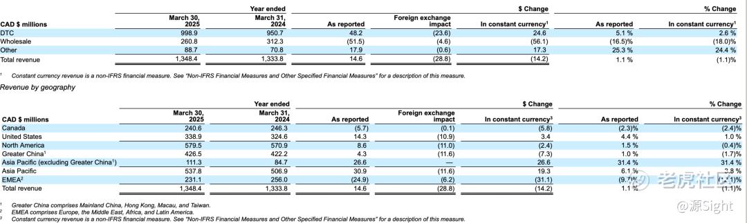 整个2025财年(截至2025年3月31日的12个月),加拿大鹅总收入增长1.1%至13.48亿加元(约合人民币71亿元)。这期间,加拿大鹅直销收入增长5.1%至9.99亿(约合人民币53亿元)加元,按固定汇率计算增长2.6%,而直销可比销售额下降3.6%;批发业务收入下降16.5%或18.0%(按固定汇率计算)。
