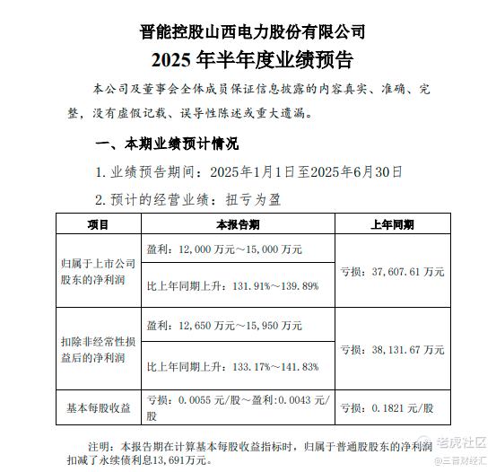 公告显示,2025年上半年,晋控电力预计归属于上市公司股东的净利润为1.2亿元-1.5亿元,较上年同期的亏损3.76亿元成功扭亏为盈,同比增幅达 131.91%-139.89%。