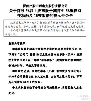 7月10日,晋控电力发布公告,股东国电投华泽(天津)能源投资有限公司(以下简称“华泽能投”)在2025年5月27日至2025年7月9日期间,通过集中竞价交易累计减持1638.33万股,持股比例从5.53%降至5%,退出公司5%以上大股东行列。