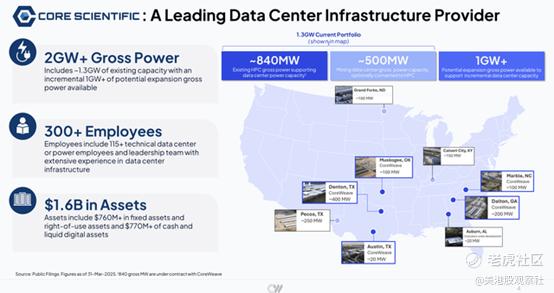 Core Scientific 主要在美国小城市运营 AI 数据中心基础设施,大部分设施已租给 CoreWeave。公司总电力容量 1.34 GW,另有 1 GW 以上的扩容机会,其中 700 MW 位于现有 CoreWeave 场址。