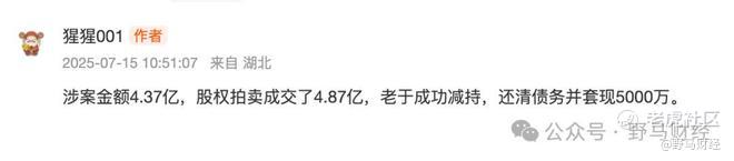 耐人寻味的是,与债权人纠纷的涉案金额只有4.37亿,股权拍卖却成交了4.87亿。有投资者戏谑:“老于成功减持,还清债务并套现5000万。”