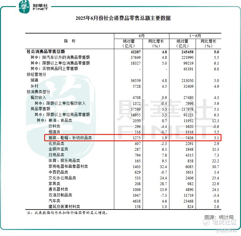 统计局披露的数据也反映出这一点。于今年6月,国内服装、鞋帽、针纺织品类零售总额为1275亿元,同比增速仅为1.9%,相较于5月同比增速4%以及上半年同比增速3.1%,出现了明显的降速。