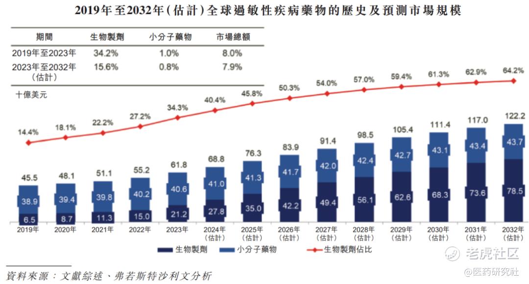根据弗若斯特沙利文数据,2019-2023年,全球过敏性疾病药物市场规模由455亿美元增长至618亿美元,复合年增长率为8.0%,预计到2032年将进一步扩大至1222亿美元,2023-2032年的复合年增长率为7.9%。 $康哲药业(00867)$