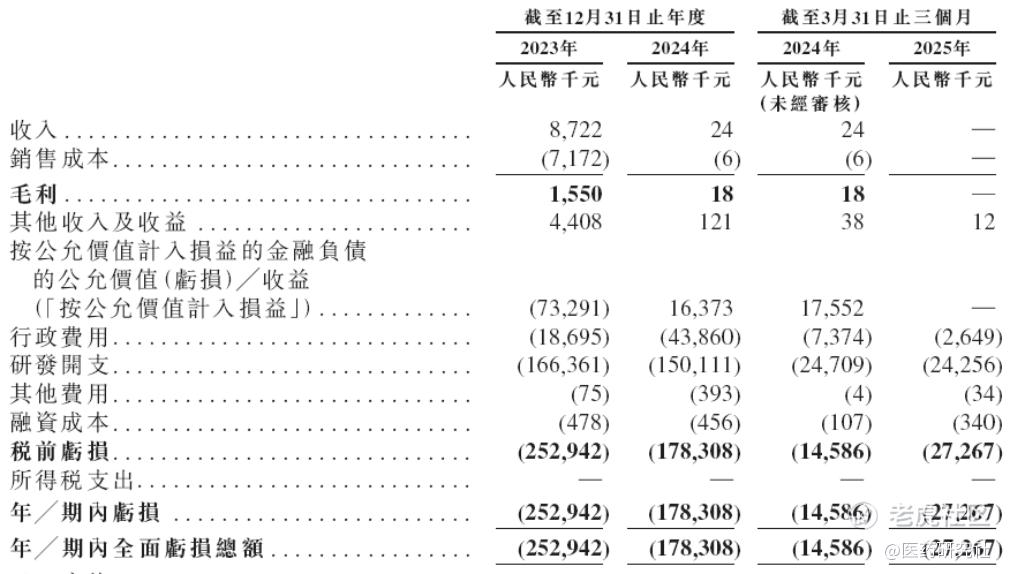 招股书显示,在2023年、2024年和2025年前三个月,麦济生物的营业收入分别为872.2万元、2.4万元和0元,净亏损分别为2.53亿元、1.78亿元和0.27亿元,相应的研发开支为1.66亿元、1.50亿元和0.24亿元。