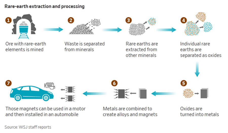 美国拥有丰富的稀土矿藏,这些稀土包括钕(neodymium)和钐(samarium)在内的17种鲜为人知的矿物。这些金属制成的磁体具有极高的强度,可以吸引重量是其自身数百倍的物体。然而,开采和加工这些稀土矿物的工艺复杂且成本高昂。美国原本繁荣的稀土行业在上世纪90年代和2000年代逐步崩溃,原因是无法与中国的竞争相抗衡。