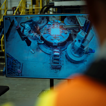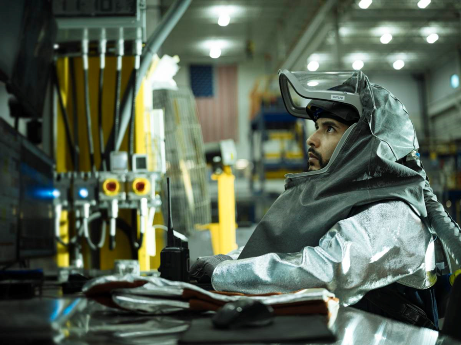 在沃思堡工厂,熔融金属的温度高达1800华氏度,这就要求工人从头到脚穿戴银色防护装备。《华尔街日报》·特雷弗·波尔赫斯。