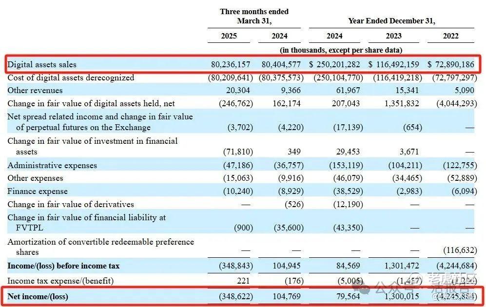 2022、2023、2024年及2025年第一季度,公司数字资产营收分别为728.9亿、1164.9亿、2502亿及802.4亿美元,相应净利润分别为-42.5亿、13亿、8亿及-3.5亿美元。