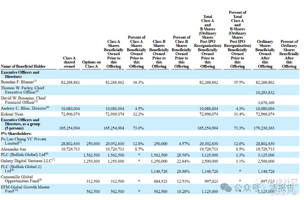 区块链公司Block.one创始人与硅谷明星投资人Brendan Blumer持有36.3%的A类股,有35.5%的股权;