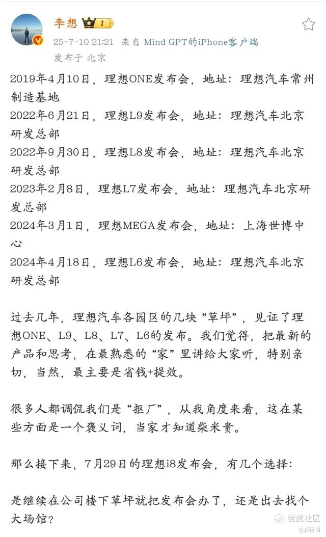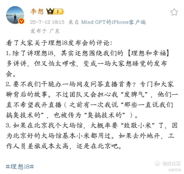 一开始,李想在微博上频频和网友互动,询问发布会场地选址、发布会内容、各种顾虑等问题,表示希望听到更多声音。