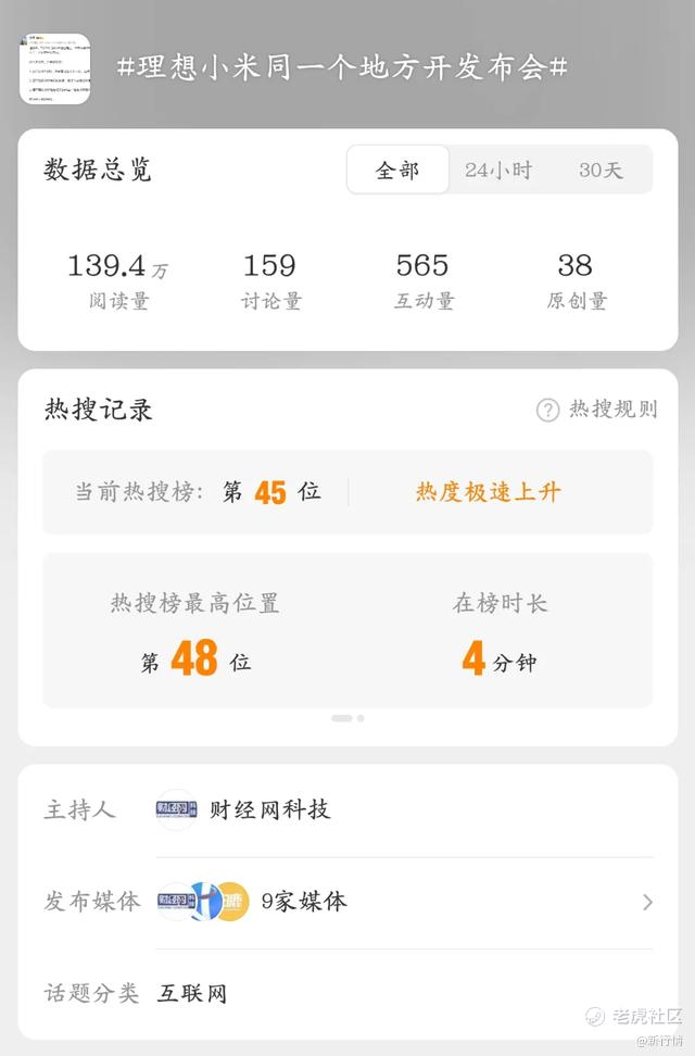随后,#理想小米同一个地方开发布会#这一消息也冲上了热搜。