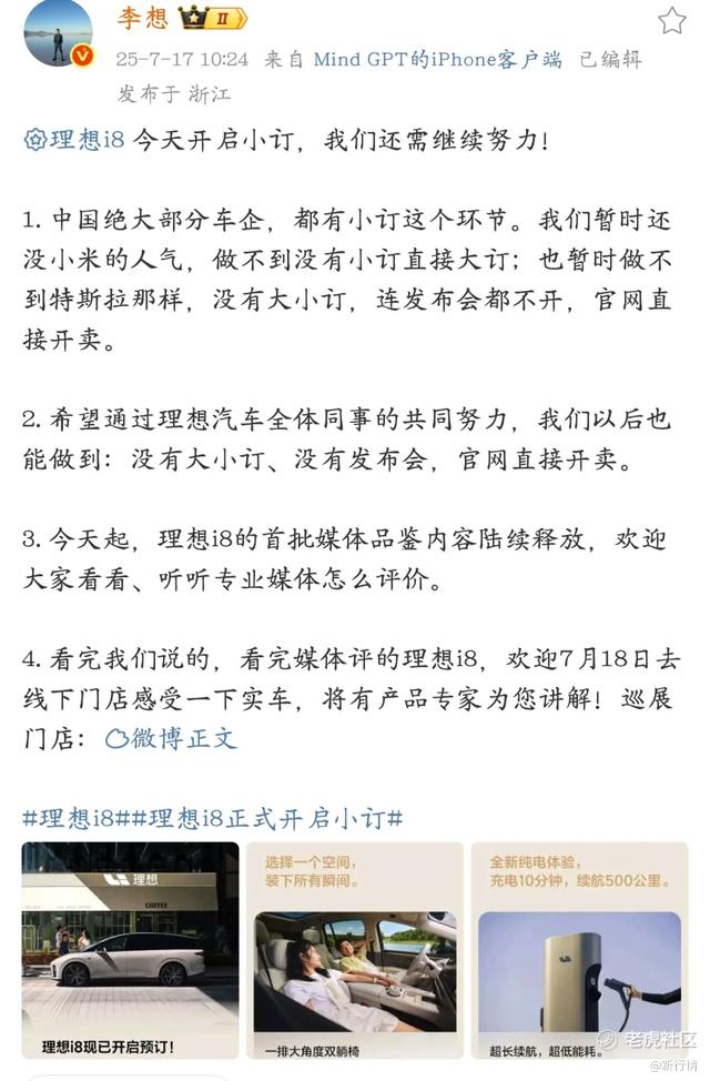 而后,李想在宣布开启理想i8预订时表示,“中国绝大部分车企,都有小订这个环节。我们暂时还没小米的人气,做不到没有小订直接大订;也暂时做不到特斯拉那样,没有大小订,连发布会都不开,官网直接开卖。”