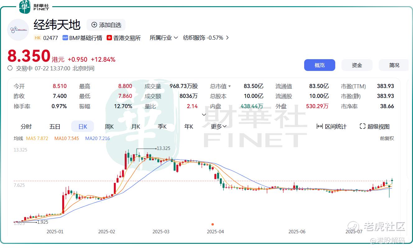 7月22日,经纬天地(02477.HK)早盘一度涨逾18.9%,随后股价有所回落,截至发稿涨幅仍达12.84%,报8.35港元/股。