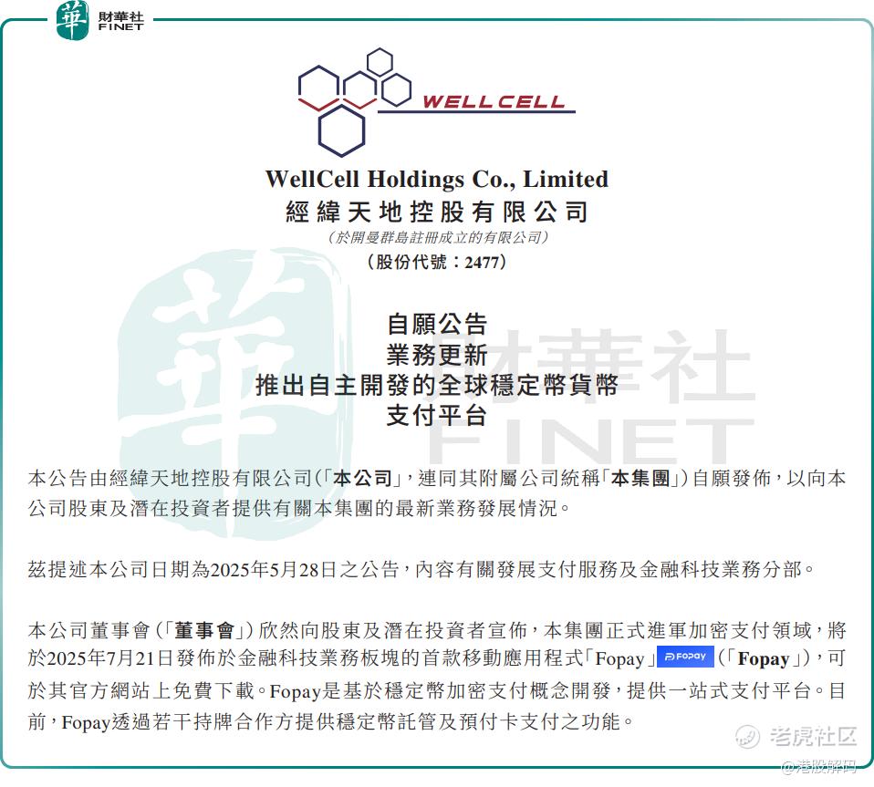 公告显示,经纬天地宣布进军加密支付领域,将于2025年7月21日发布首款移动应用程式“Fopay”,提供一站式支付平台。Fopay基于稳定币加密支付概念开发,目前透过若干持牌合作方提供稳定币托管及预付卡支付功能。