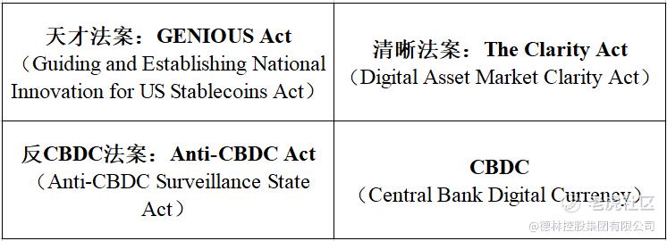 美国总统特朗普于7月18日签署了加密货币相关的三个法案:《天才法案》、《清晰法案》和《反CBDC法案》。其中《天才法案》为锚定美元的稳定币制定了监管框架,催生对短期美债的巨大需求;《清晰法案》为数字资产交易和监管提供了明确指引;《反CBDC法案》重在阻止美联储未经国会授权直接向个人发行央行数字货币以及将央行数字货币用于实施货币政策。这三大法案前两个是亡羊补牢,第三个属于未雨绸缪、表明姿态。