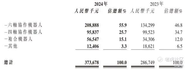 越疆科技2024年六轴协作机器人收入为2.09亿元,较上年同期的1.34亿元增长55.5%,占营收的比例为55.9%;