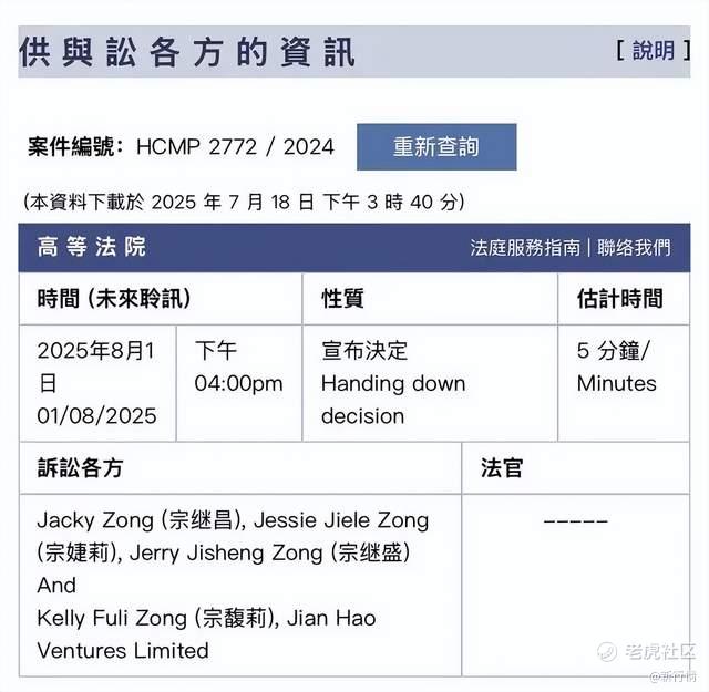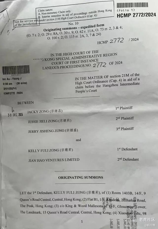 近日,香港高等法院表示,8月1日,这场备受全网关注的纠纷案将在香港高等法院进行聆讯,性质为“宣布决定”,预计时长仅5分钟。诉讼各方为:宗继昌、宗婕莉、宗继盛以及宗馥莉和Jian Hao Ventures Limited。