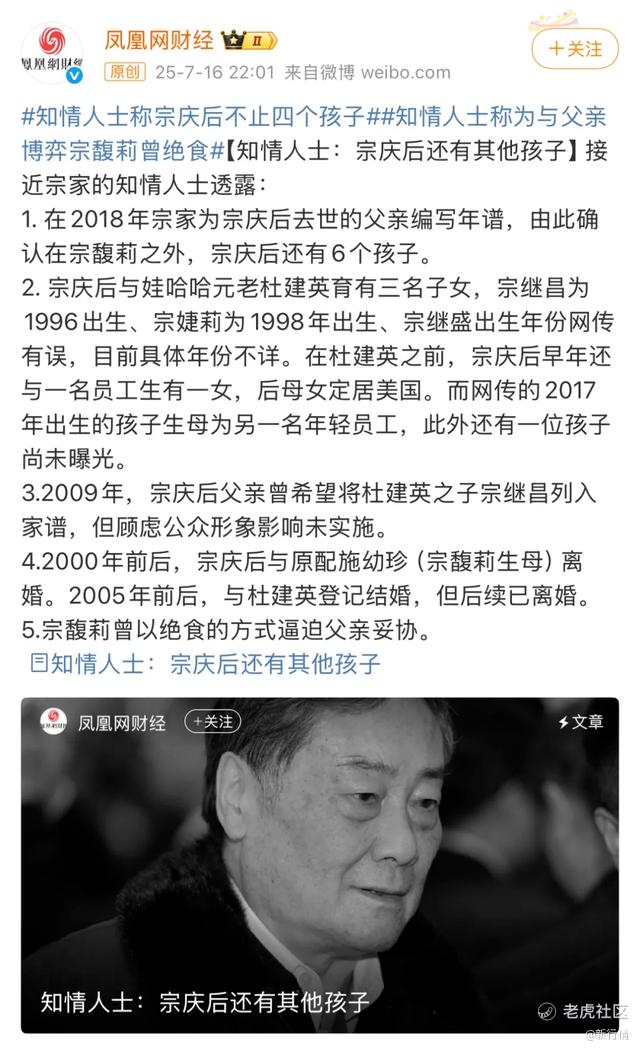 此前,有知情人士透露,宗庆后在宗馥莉之外,还有6个孩子,并且表示宗泽后和杜建英存在过婚姻关系。