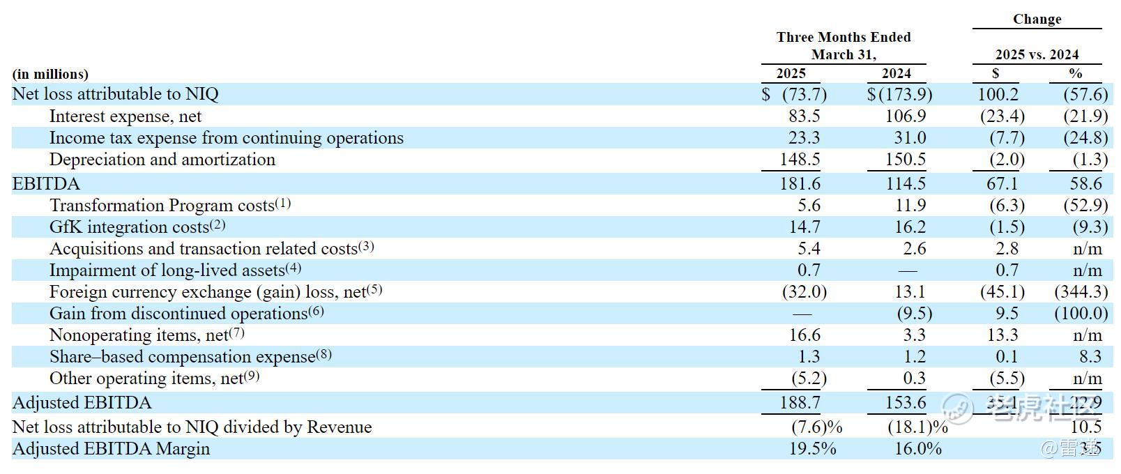 NIQ Global在2025年第一季度营收为9.66亿美元,上年同期营收为9.62亿美元;持续运营亏损为7180万美元,上年同期的持续运营亏损为1.82亿美元;净亏损为7180万美元,上年同期的净亏损为1.73亿美元。