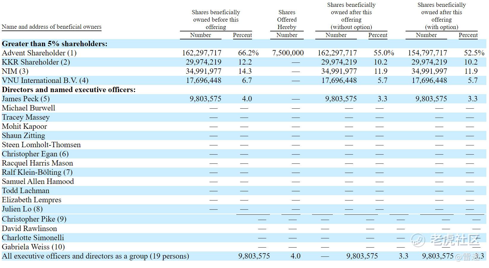 IPO后,Advent Shareholder持股为55%,KKR Shareholder持股为10.2%,NIM持股为11.9%,VNU International持股为5.7%,James Peck持股为3.3%。