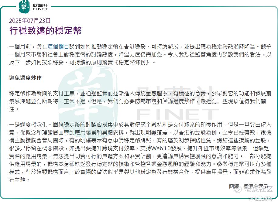 7月23日,香港金管局总裁余伟文发文再谈稳定币,他指出,应警示泡沫化风险,多家上市公司无论主业是否相关,只要宣布涉足稳定币,股价即飙升、交易量激增。金管局已重申初期仅批出“数个”牌照,呼吁投资者冷静消化所谓“利好”。