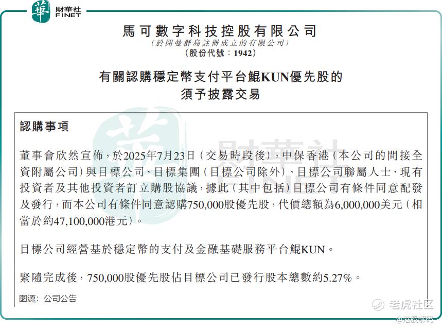 近日,前脚刚配股筹资约1亿港元的 $马可数字科技(01942)$ ,右脚就投资了稳定币平台,其以600万美元认购稳定币支付平台鲲KUN优先股,获得后者5.27%股权。