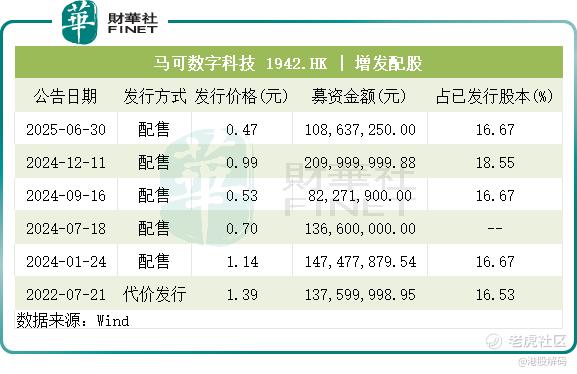 Wind数据显示,2024年1月以来,马可数字科技累计进行了5次配股融资操作,最近一次是在今年6月底。该5次再融资,马可数字科技合计募资金额达6.85亿港元,远高于其2020年港股IPO时的募资额。