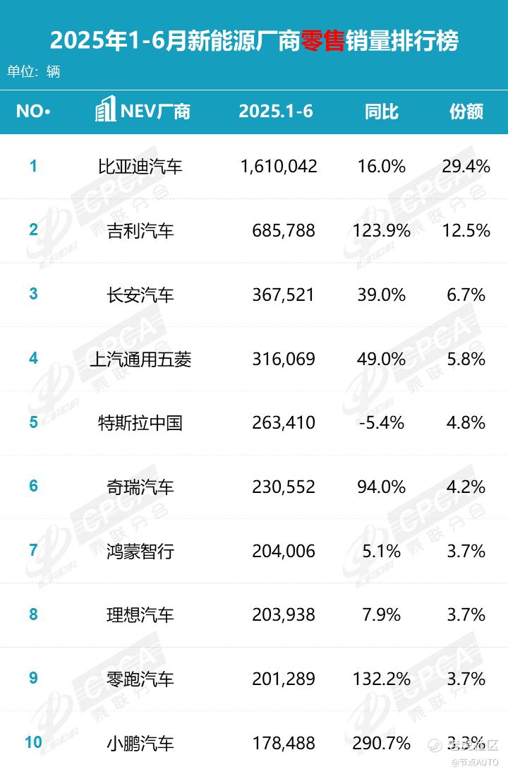 今年前6个月,TOP 5新能源汽车厂商销量占整体市场份额的59.2%,TOP 10则占比77.8%。