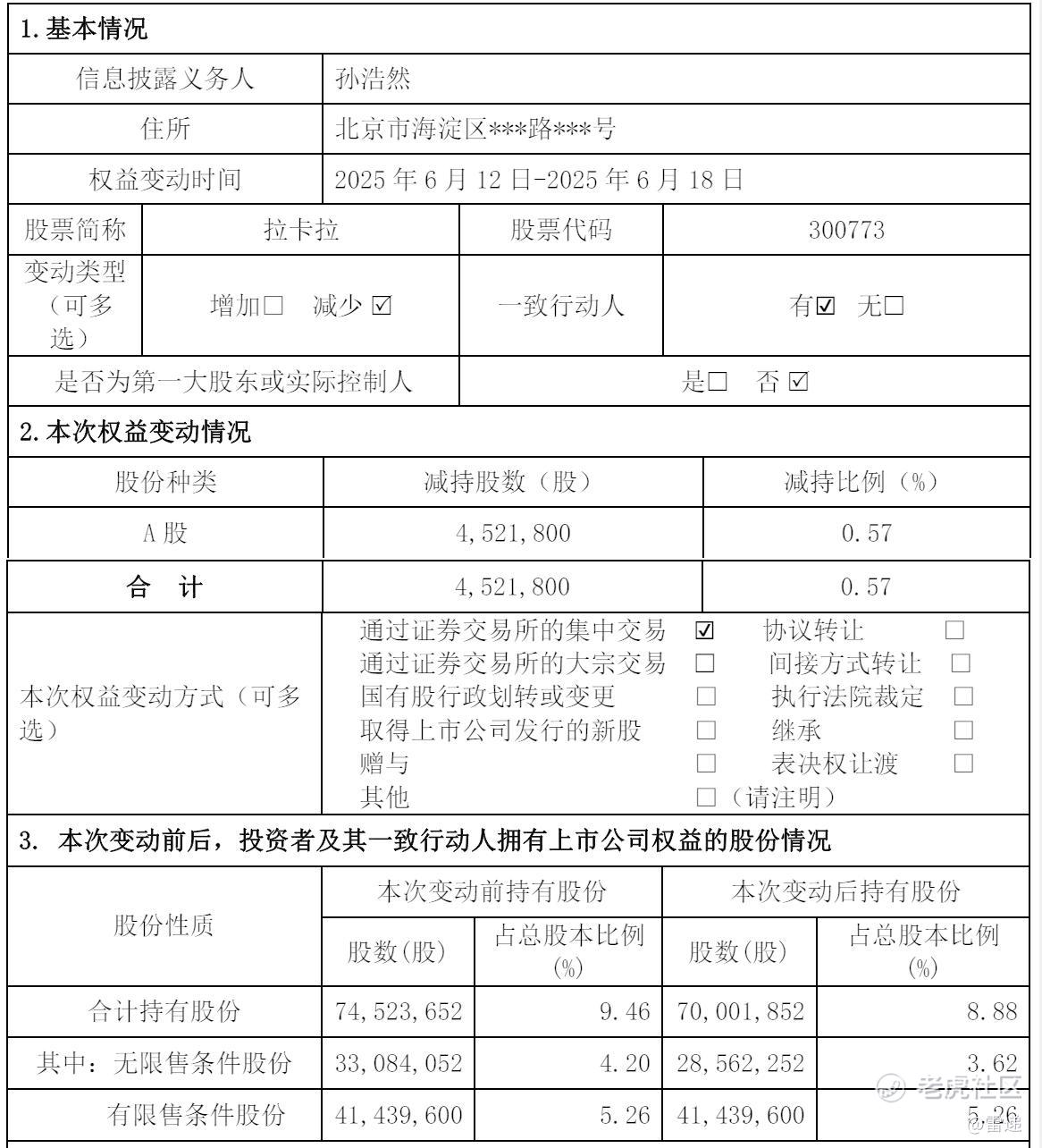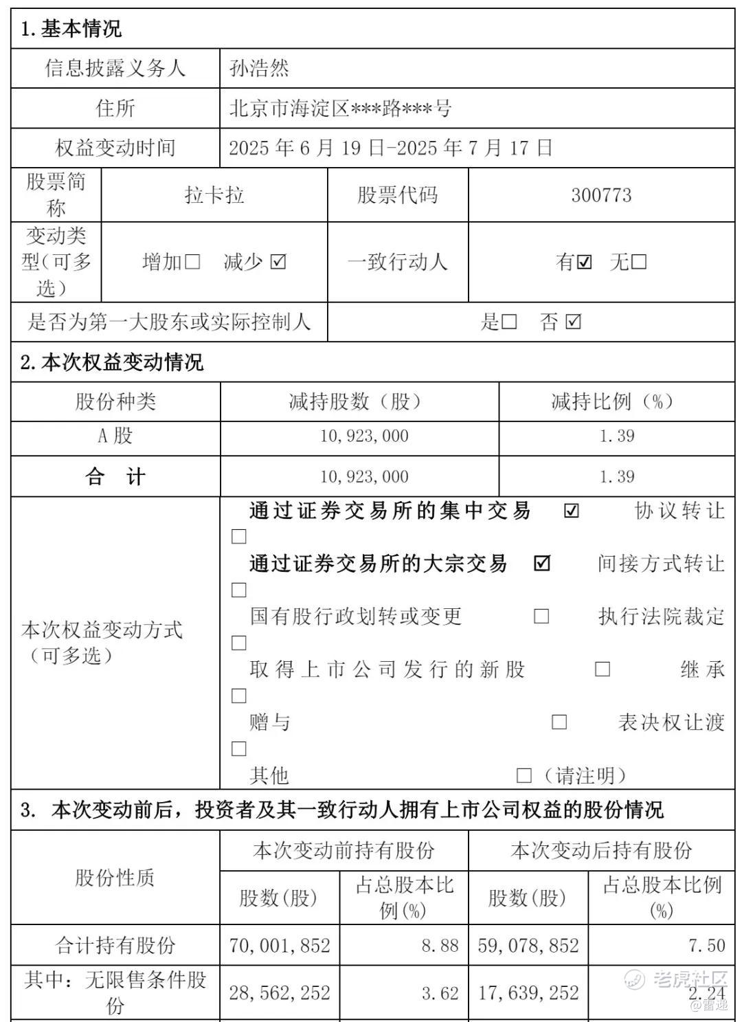 几天前,拉卡拉也发布公告,称孙浩然于2025年6月19日-2025年7月17日期间通过集中竞价方式、大宗交易方式累计减持公司股份1092.3万股。