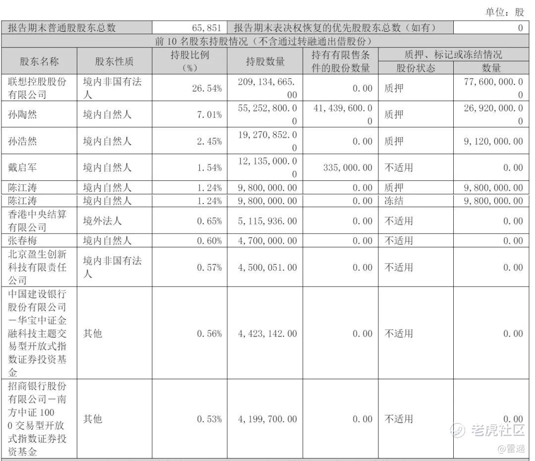 截至2025年3月31日,联想控股持股为26.54%,孙陶然持股为7.01%;孙浩然持股为2.45%,戴启军持股为1.54%,陈江涛持股为1.24%;