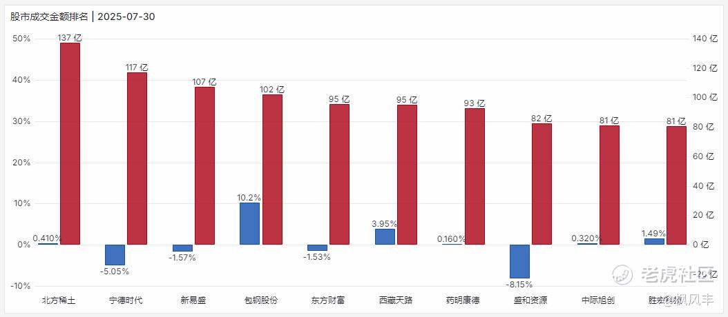 1、成交额前三:$北方稀土(600111)$ 、$宁德时代(300750)$ 、$新易盛(300502)$