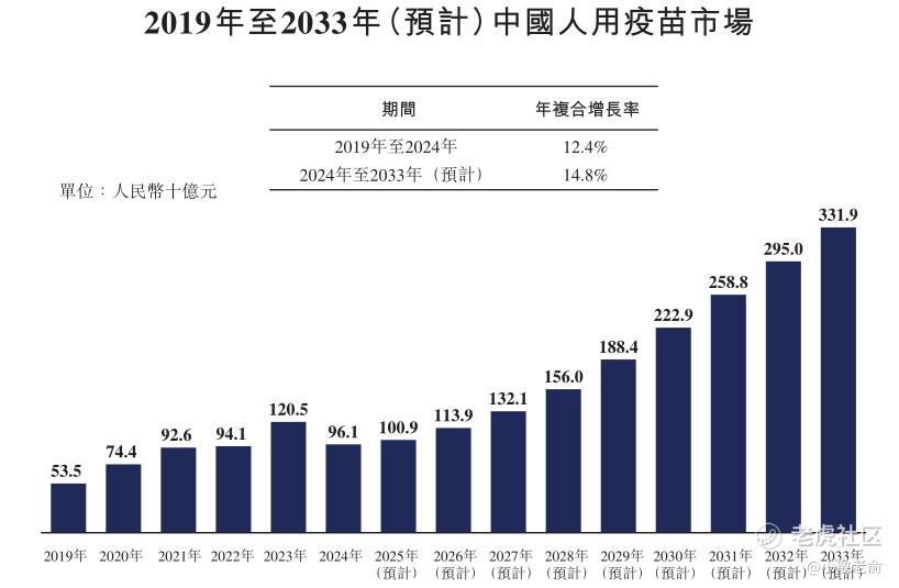 在产值方面,不计入新冠肺炎疫苗的情况下,中国人用疫苗市场由2019年的人民币535亿元增长至2024年的人民币961亿元,年复合增长率为12.4%。在创新疫苗预期持续推出的推动下,中国人用疫苗市场预期于2033年进一步增长至人民币3,319亿元,2024年至2033年的年复合增长率为14.8%。