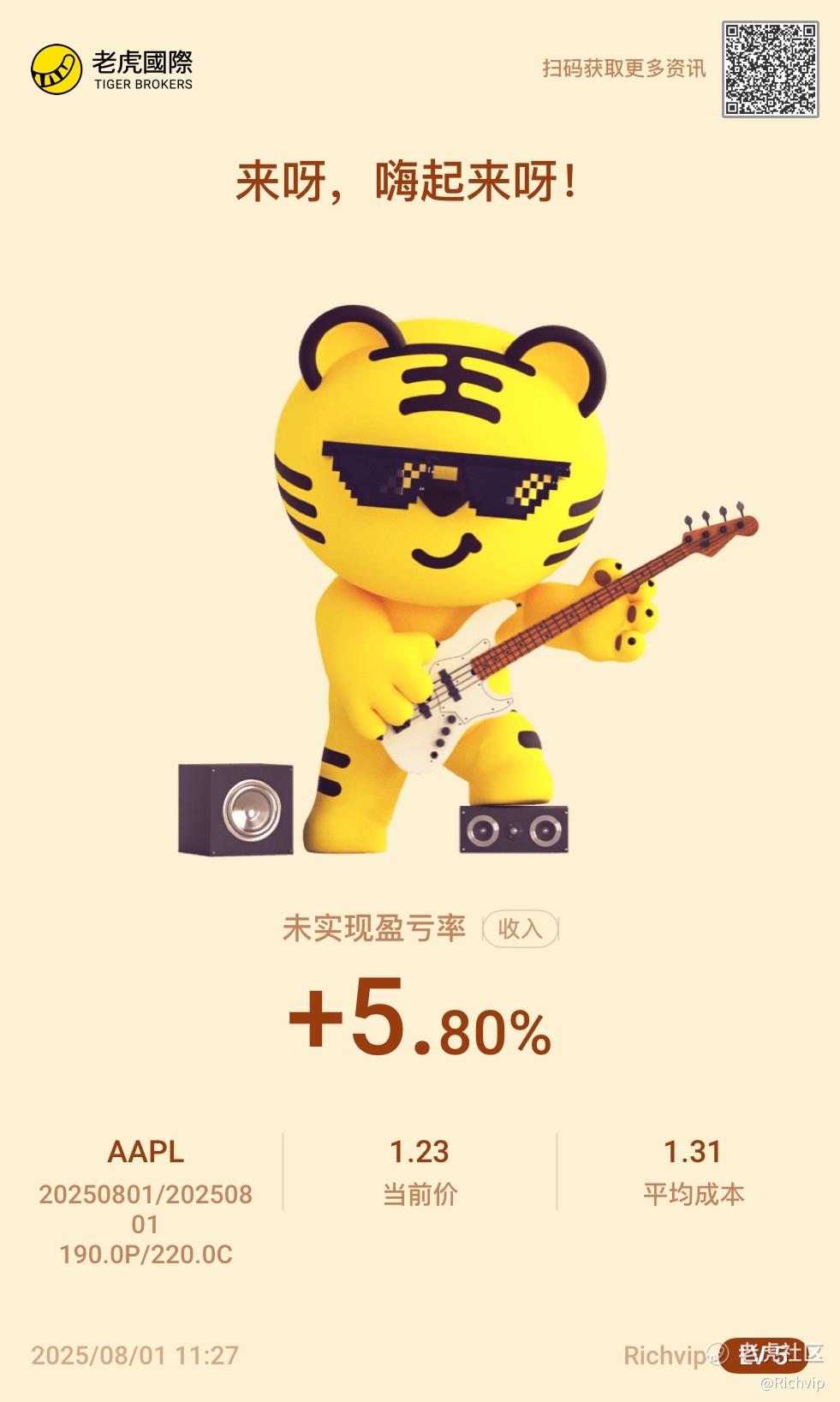 $苹果 STRANGLE 250801 CALL 220.0/PUT 190.0$ 苹果盘后的财报为三年多来最好的成绩,今晚的苹果财报策略将进入丰收期!