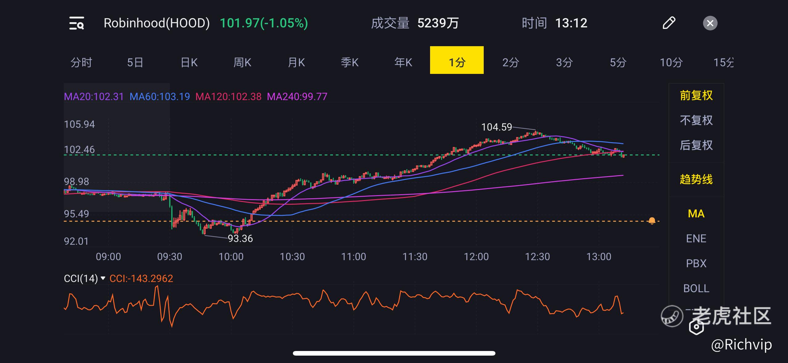 由于非农就业数据不及预期,今晚标普500和纳指开盘就是一波急跌。但罗宾汉多方一口气把股价最高拉到了104.59附近。临晨多空再次厮杀,拉到101元支撑位附近。精彩瞬间不亚于武侠打斗的大场面,甚是壮观!