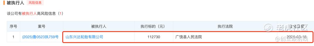 天眼查显示,2025年3月,兴达轮胎被列为被执行人,执行标的为11.27万元。此外,兴达轮胎还被列为限制高消费企业。
