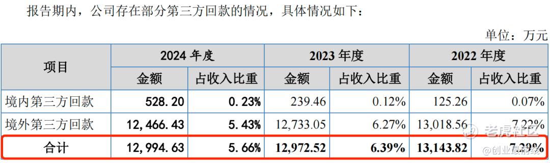 2022年至2024年(以下简称“报告期”),公司第三方回款金额分别为1.31亿元、1.30亿元和1.30亿元,占当期营业收入的比例分别为7.29%、6.39%和5.66%。