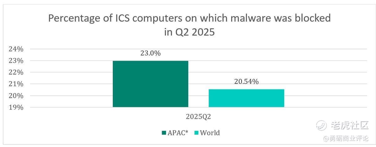 就拦截到恶意对象的ICS计算机总体百分比而言,2025年第二季度,亚太地区达到23%,比全球平均水平20.54%高出近3%。