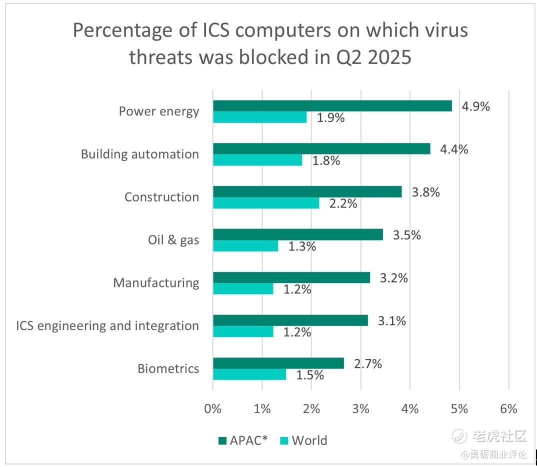 2025年第二季度,受病毒威胁影响最大的亚太地区行业包括电力能源、建筑自动化、石油与天然气、制造业以及工业控制系统(ICS)工程与集成。