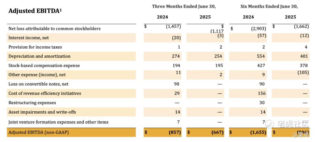 Rivian在2025年第二季度Adjusted EBITDA为-6.67亿美元,上年同期为-8.57亿美元。