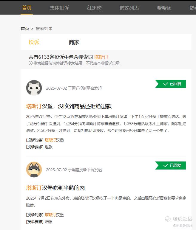 在黑猫投诉平台上,截至目前涉及塔斯汀汉堡的投诉共有6133条,绝大多数与食品安全有关,如食材不熟、异物混入、食材不新鲜等均为投诉较多的问题。