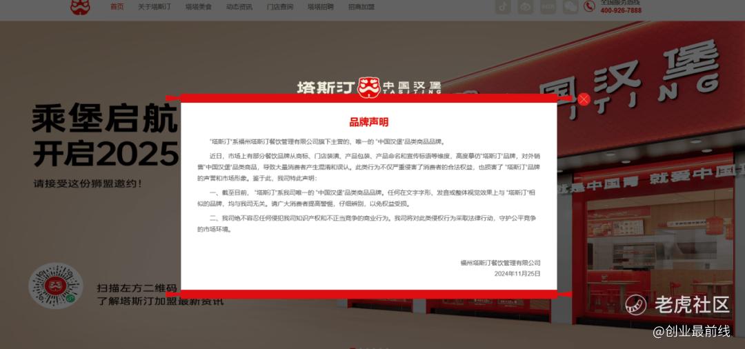 甚至点开塔斯汀官网,首先映入眼前的也是一张品牌声明信,称市场上有部分餐饮品牌从商标、门店装潢、产品包装、产品命名和宣传标语等维度,高度摹仿“塔斯汀”品牌,对外销售“中国汉堡”品类商品,导致大量消费者产生混淆和误认。