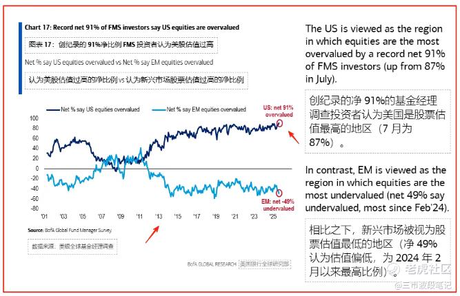 美银月度基金经理调查显示,约 91%受访者持“美国股市价格过高”观点的比例创下2001年以来的最高水平。 美银策略师Michael Hartnett表示,投资者目前预计美国经济硬着陆的可能性已降至1月份以来的最低水平。