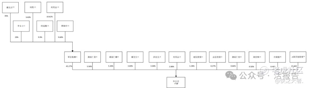IPO前,军信股份在上市前的股东架构中,由主要控股股东戴道国先生以直接持股、间接持股及投票权委托相结合的方式,合计控制公司约64.92%的权益;其余股份由其他A股股东持有,占比约35.08%。