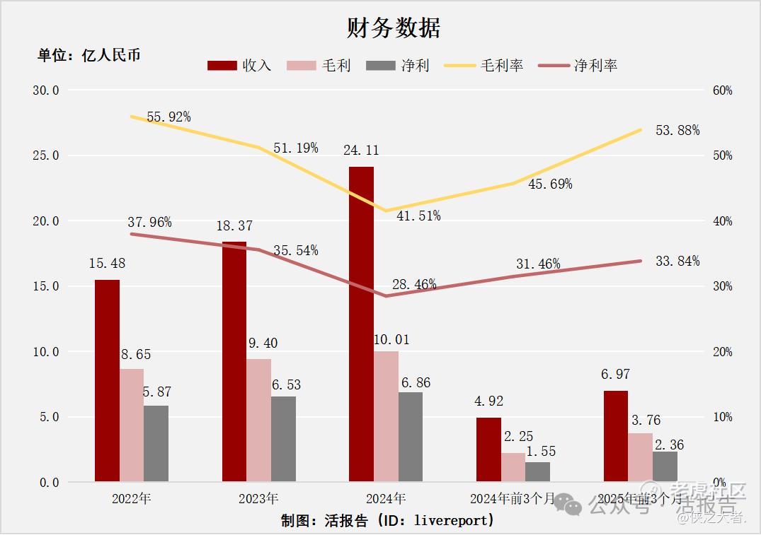 该图表展示了公司2022年至2025年前3个月的财务数据,可以看出收入整体呈增长趋势,毛利与净利也随收入增长而增长,毛利率在2022 - 2024年呈下降趋势后于2025年前3个月回升至53.88%,净利率则是先降后升,整体反映出公司在这段时间内收入规模扩张,盈利指标虽有波动但后期向好 。