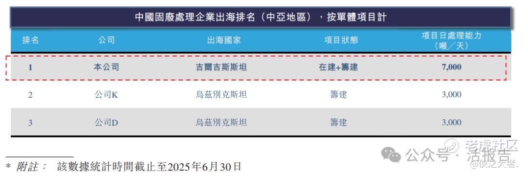中亚区域固废处理市场处于早期阶段,多数项目尚在筹建中。本公司为目前中亚地区唯一在建项目运营方,按单体项目日处理能力计,公司排名中亚地区第一。