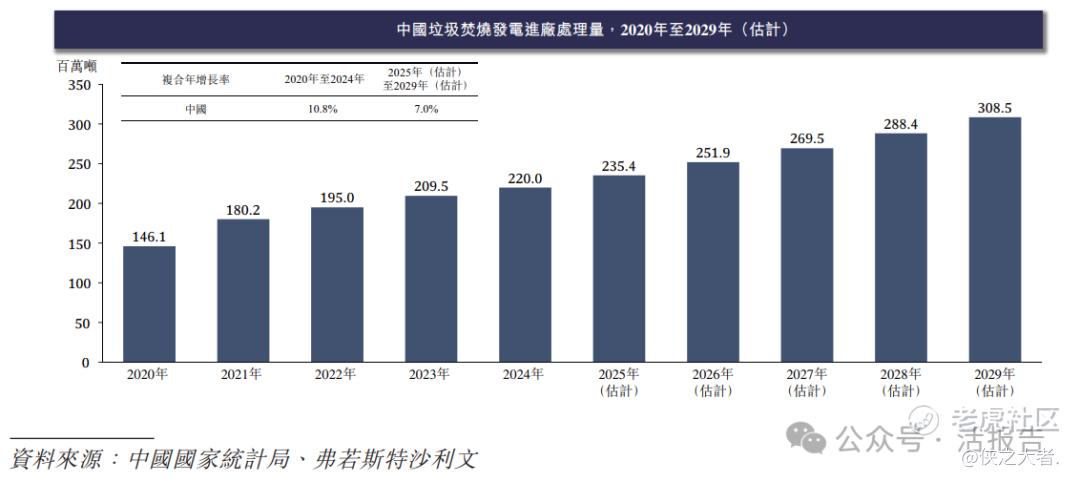 随着城市化进程持续推进,中国垃圾焚烧发电进厂处理量及增长将趋于稳定;同时,历史填埋垃圾对土壤造成的污染问题亟需通过焚烧处理解决,以往历史留存的垃圾得以重新进厂进行无害化焚烧处理,进一步扩大了市场空间。预计2025年至2029年,全国垃圾焚烧发电进厂处理量的复合年增长率将达7.0%,到2029年增长量将达308.5百万吨。