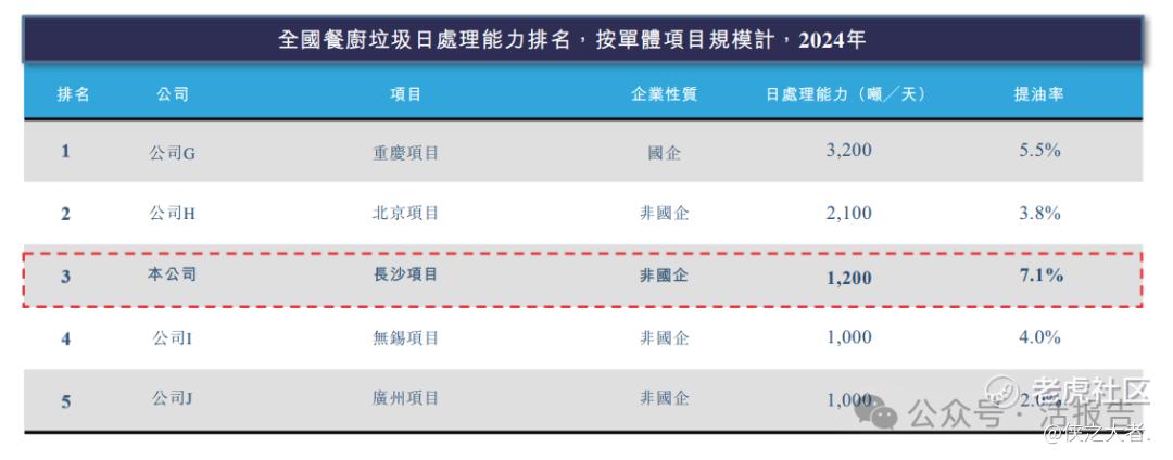 根据弗若斯特沙利文(Frost & Sullivan)的资料,中国的餐厨垃圾资源化利用具有很高的技术壁垒,并受政策及地方政府投资推动。该行业分散,小型企业在区域内经营。竞争优势取决于技术路线选择、高效的收集及运输系统以及营销资源型产品的能力。专业处理企业在特定区域或技术上表现出色,而大型环保公司则依托更广泛的资源承接大型项目。全国餐厨垃圾处理项目是城市餐厨垃圾从源头收运到末端无害化及资源化利用的重要环节,具备高有机质废弃物的预处理、油脂回收、厌氧发酵及污水处理等功能。按全国餐厨垃圾处理的单体项目日处理能力计,公司排名全国第三,其中垃圾提油率全国第一。