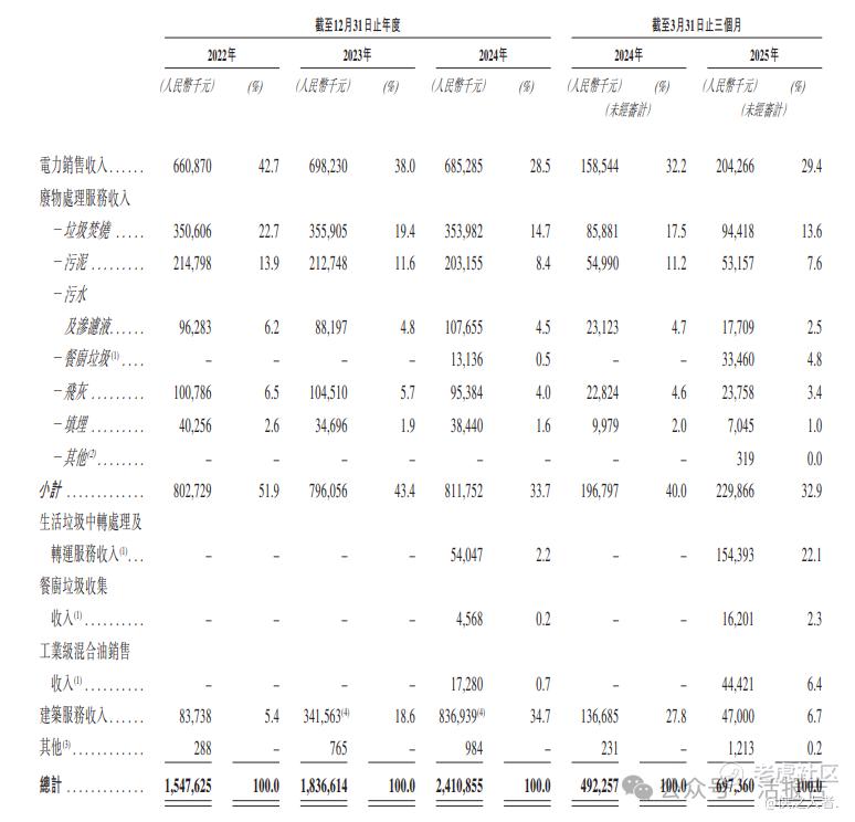 公司的收入主要包括(i)电力销售收入;(ii)废物处理服务收入;(iii)建筑服务收入;(iv)废物中转处理服务收入;(v)餐厨垃圾收集收入;及(vi)工业级混合油销售收入。