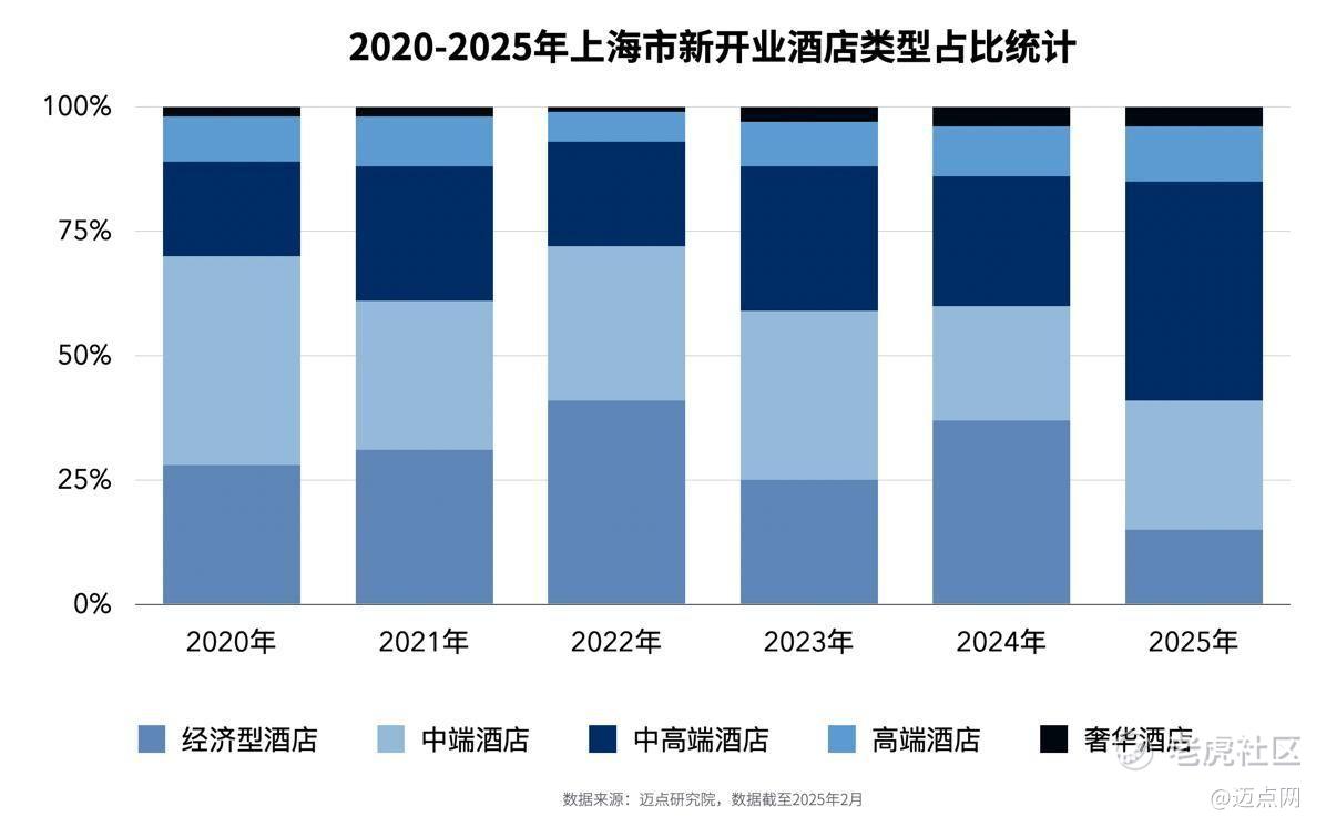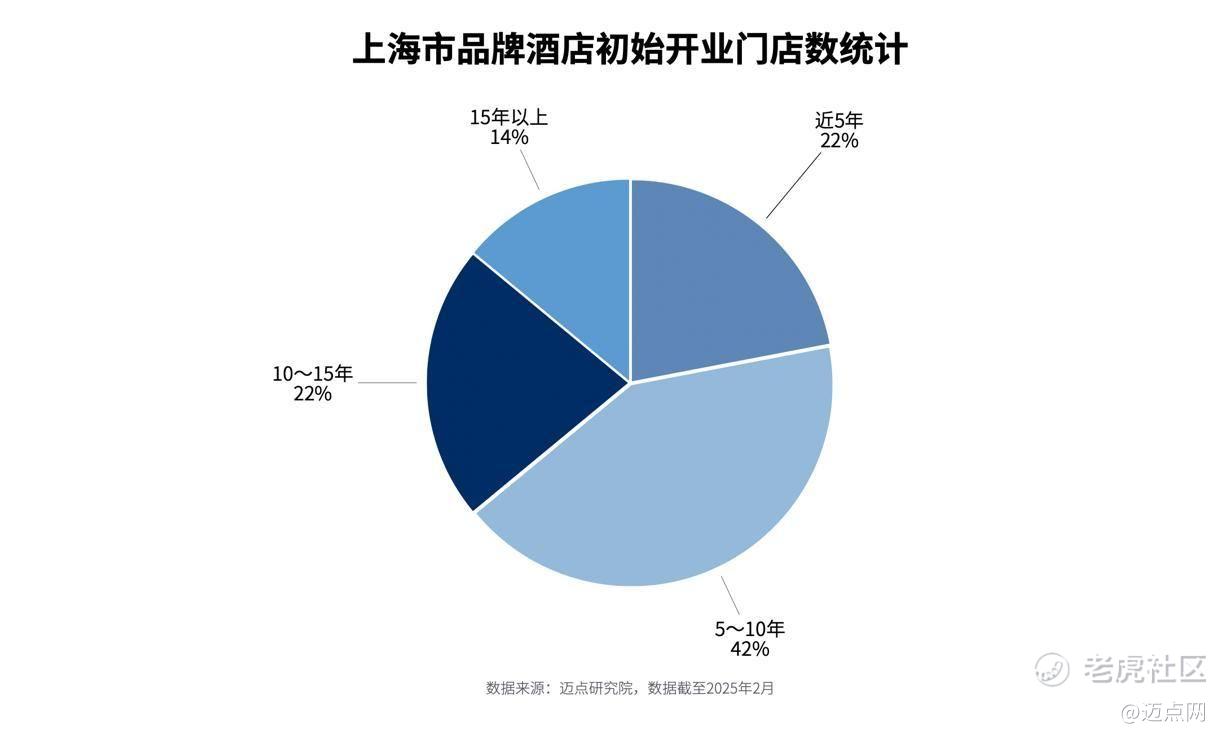 迈点研究院不完全统计,上海近5年,中高端酒店开业数量持续增长,反映出投资者对这一市场的持续信心;连锁品牌的超过5年的开业门店数量占比高达78%,存量改造需求巨大;同时,市场竞争日趋白热化,以上海外滩核心区为例,一公里范围内密集分布87家酒店,竞争密度远超常规水平。