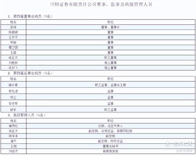现任董事长吴琼于2012年9月在川财证券登记职业,历任副总裁兼董事会秘书,曾分管债券业务,2023年11月由副总裁升任董事长,接替到龄退休的金树成,金树成此前任中国华电任总经理、党委副书记。