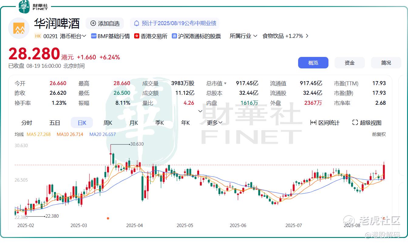受此消息提振,8月19日,华润啤酒股价午后强势拉升,盘中一度飙升7.66%,收盘涨幅为6.24%,报28.28港元/股。